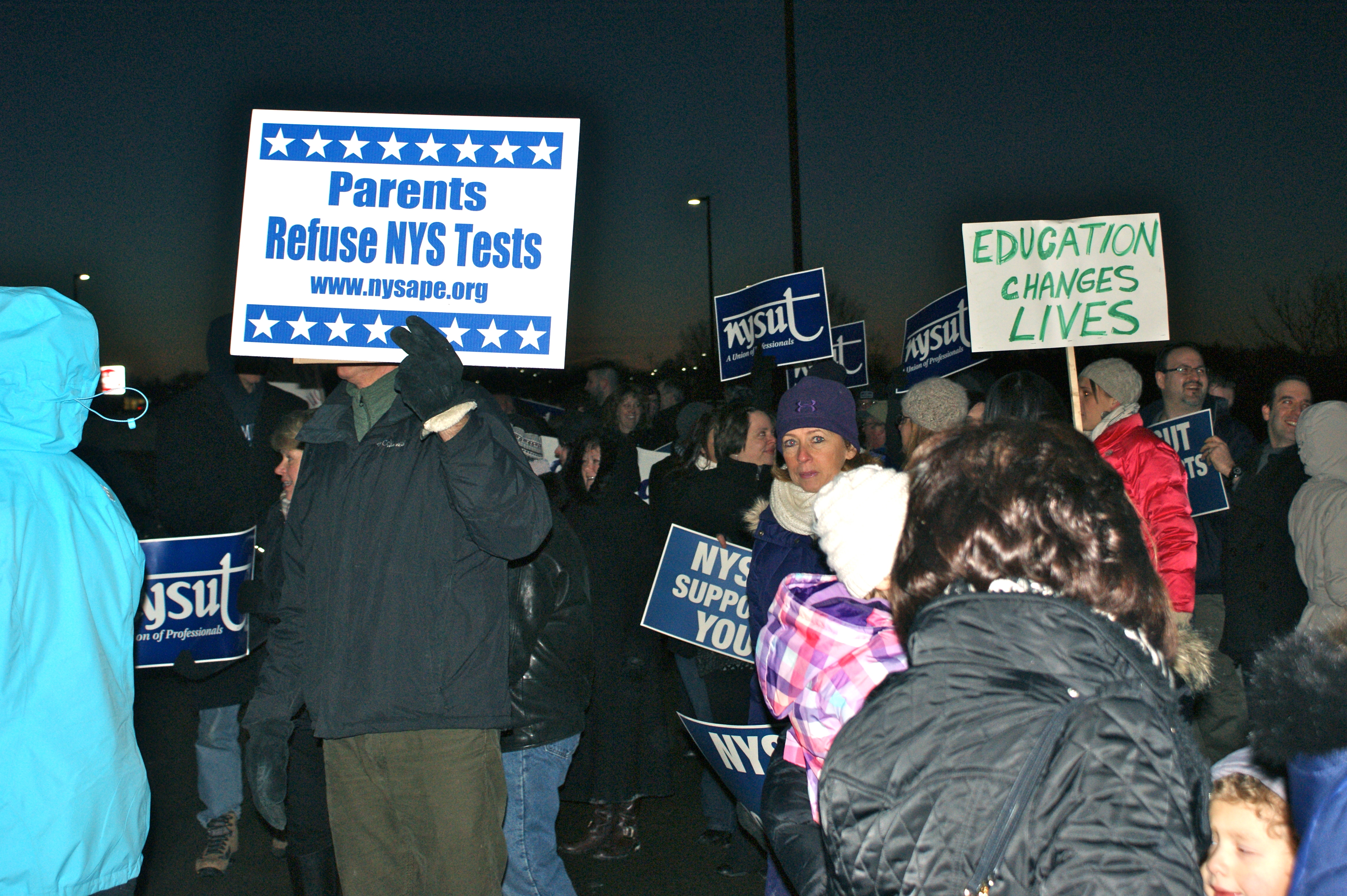 Huddled close, bundled up in hats, gloves and scarves amid the crush of winter, yet determined and boisterous, they came in response to New York State Governor Andrew Cuomo’s proposed public education reforms in his recent State of the State address, carrying signs and shouting slogans before a meeting of local school board presidents.