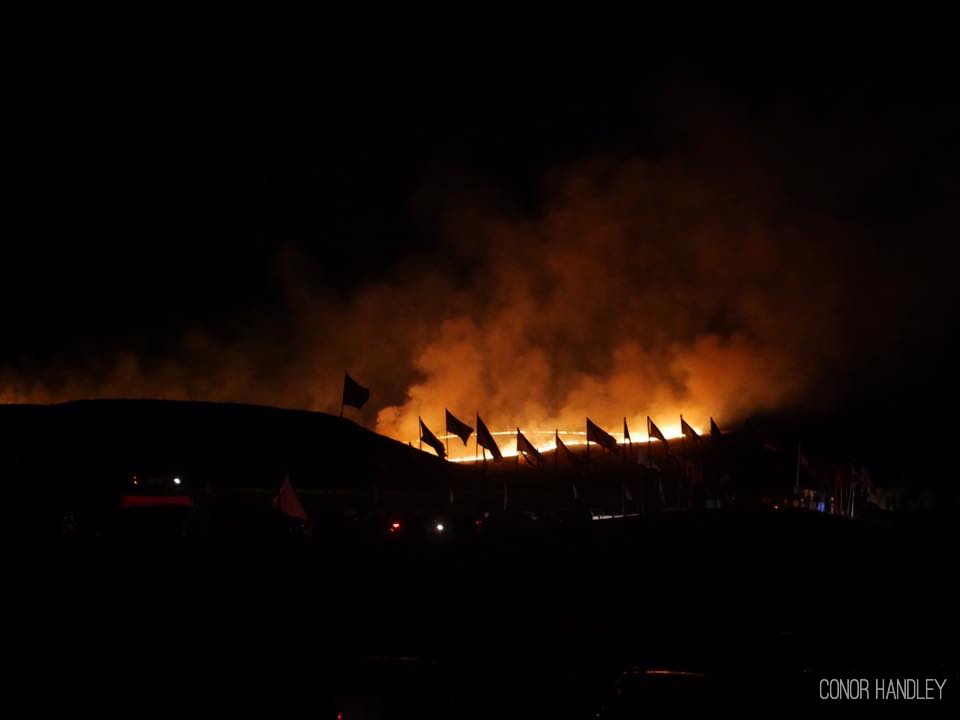 Fire on one side and the lights from DAPL construction and the police blockade on the other. No fire support came for over 7 hours. The fire was within a few hundred feet of camp just across the 1806 highway but the wind kept us safe and blew it in the other direction, towards the construction site.