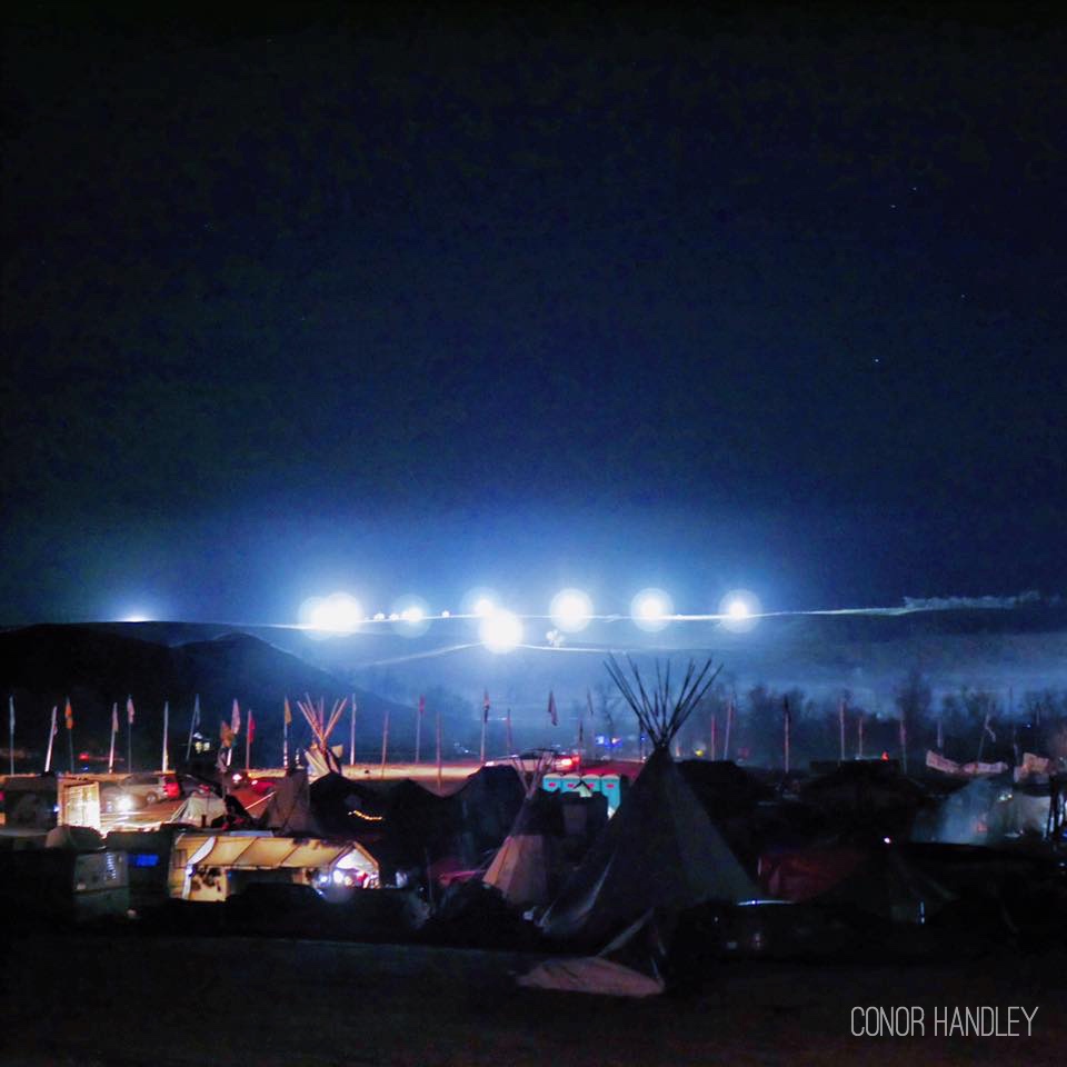 Damn, today was hard. People got hurt, thank creator everyone made it out with their lives. The police, national guard, DAPL (can’t really tell the difference anymore) have set up massive spotlights into our camp that shine all night long, they fly planes and helicopters over us 24hrs a day, even jets with no lights when they feel like it. They are trying to deprive us of sleep, make us lose ourselves and turn on one another. We are living in a war zone. Now I know what my ancestors felt when they were confined to military camps and reservations. But just like our ancestors, still we preserver. Right now I hear roundance songs in the distance, laughter from a hundred different camps as we take care of our wounded and eat dinner. I love this place and the people who have come here to fight for our children’s future. We won’t stand down… And sorry, Obama, another route isn’t going to cut it, we are in this until this black snake and all the rest are dead.