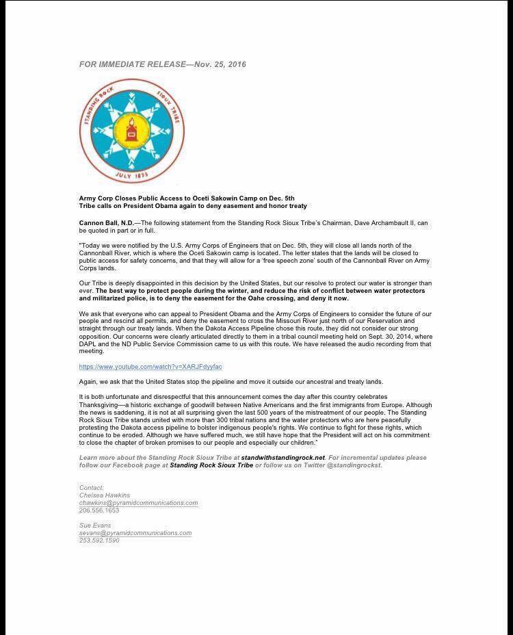 UPDATE: The Chairman of the Standing Rock Sioux Tribe, Dave Archambault II, issued the following statement in response to the eviction notice by the Army Corps of Engineers.