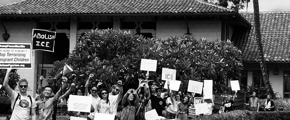 Spokespeople urged ICE officers to become conscientious objectors. Honolulu PD came and met with a legal observer but didn’t arrest anyone. The press came. Protesters stood firm. Activists agitated; protesters chanted. Some sang. After about 90 minutes the group left chanting “We’ll be back!” and met with the press on the sidewalk in front.