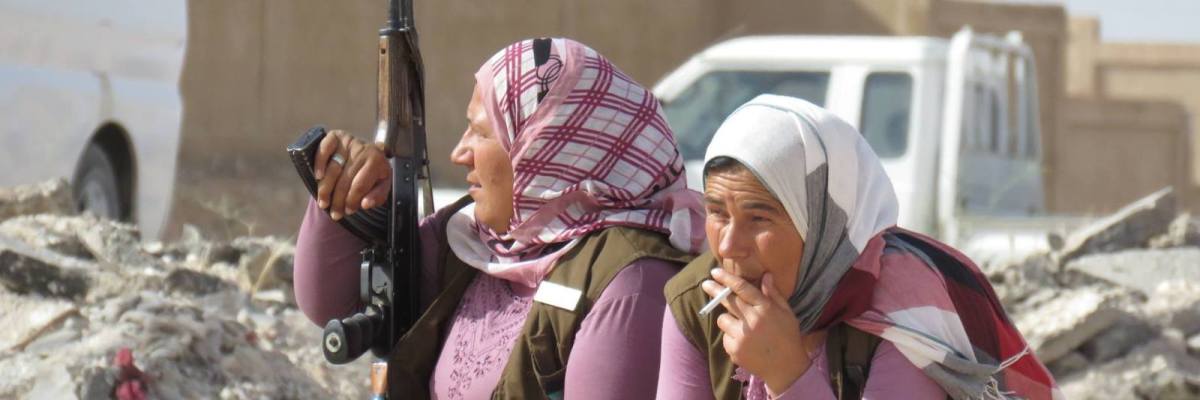Two local HPC forced on duty during a martyrs ceremony in Kobane, 2016. Copyright: Hawzhin Azeez.However, before the establishment of this alternative system was made possible an alternative ideology needed to emerge that would provide a blueprint for this ideal, democratic society. This system works based on the Kurdish leader Abdullah Ocalan’s theory of Democratic Confederalism, inspired by the American theorist Murray Bookchin’s Social ecology. One of the foundational values of Democratic Confederalism is an anti-hierarchy approach to communal structures and co-existence, starting with the difficult task of promoting women’s liberation and participation in all spheres of the public arena. A quota of 40/60 per cent participation must exist across all administrative and decision-making structures. This also includes the co-chair system of all leadership position being held by one male and one female. Essentially, a system based on active promotion of equality across ethnic, religious and decision-making process is fundamental for this anti-hierarchical system to work. This system is also established on the foundation that institutions with high level of women’s participation tend to be more inclusive and democratic in nature. According to Ocalan: