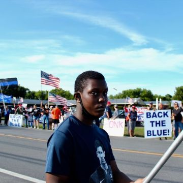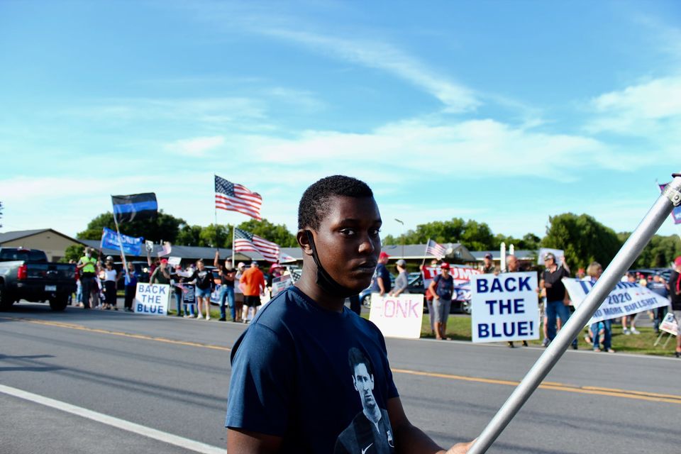 This young Utica Abolitionist holds the line, undeterred by the constant stream of death threats and racial slurs from the Trump and Tenney supporters. (Photo credit: Eamon Handzel)