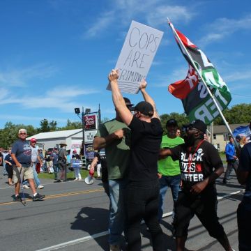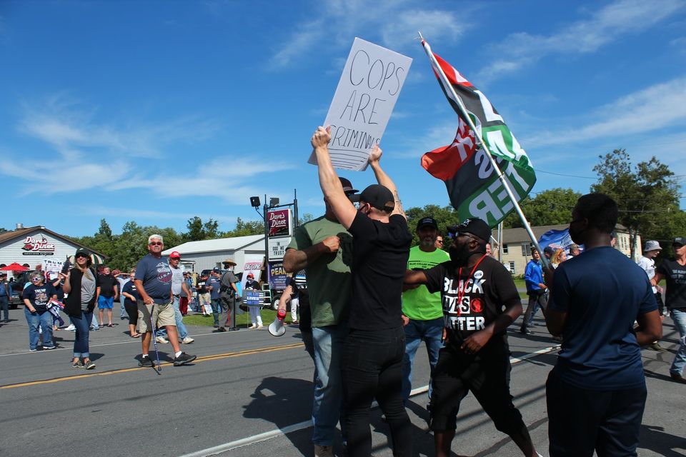 Trump and Tenney supporters stream across the road and attempt to start fights with BLM activists. The BLM activists kept their cool. (Photo credit: Eamon Handzel)