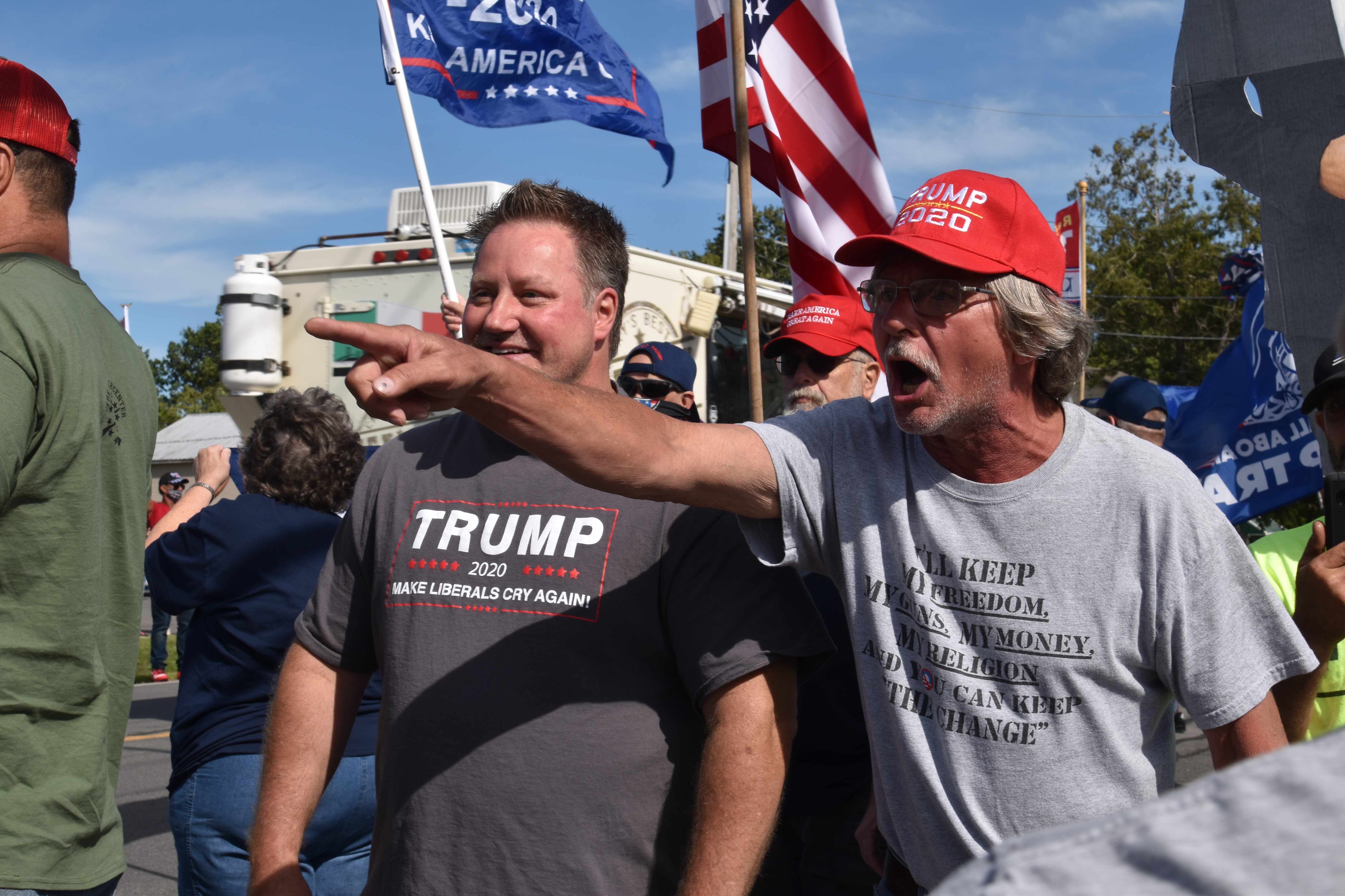 Trump supporters charged across the road and encircled peaceful Black Lives Matter activists. They then hurled threats at them and tried to instigate fights. Trump and Tenney supporters rally in front of Dave’s Diner which sponsored and promoted the event. (Photo Credit: Love and Rage)