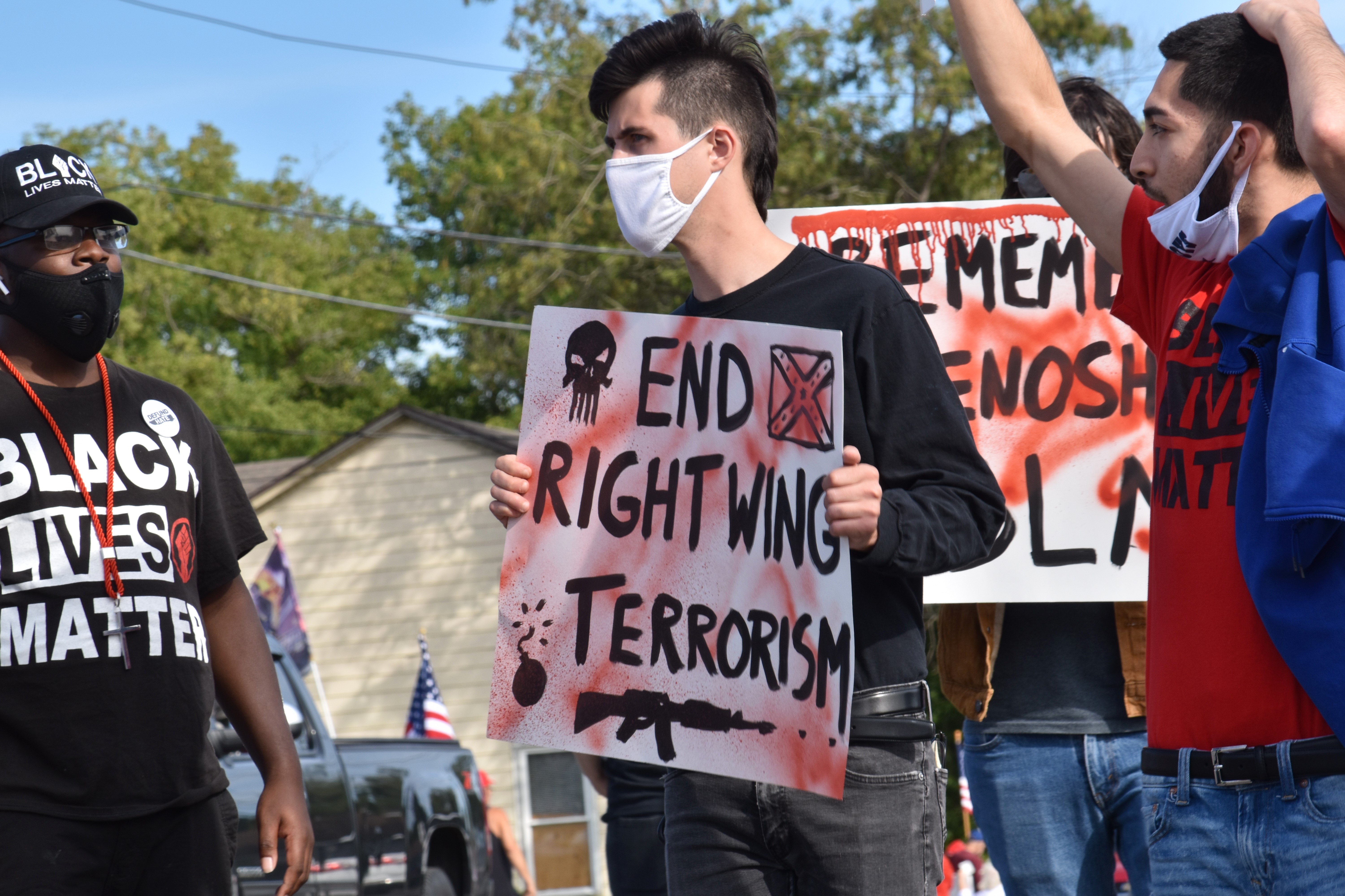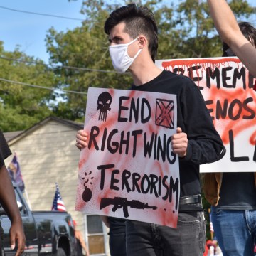 A Black Lives Matter activist holds a sign that reads “End Right Wing Terrorism” – a fitting statement for the volatile political climate we find ourselves in. (Photo Credit: Love and Rage)