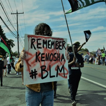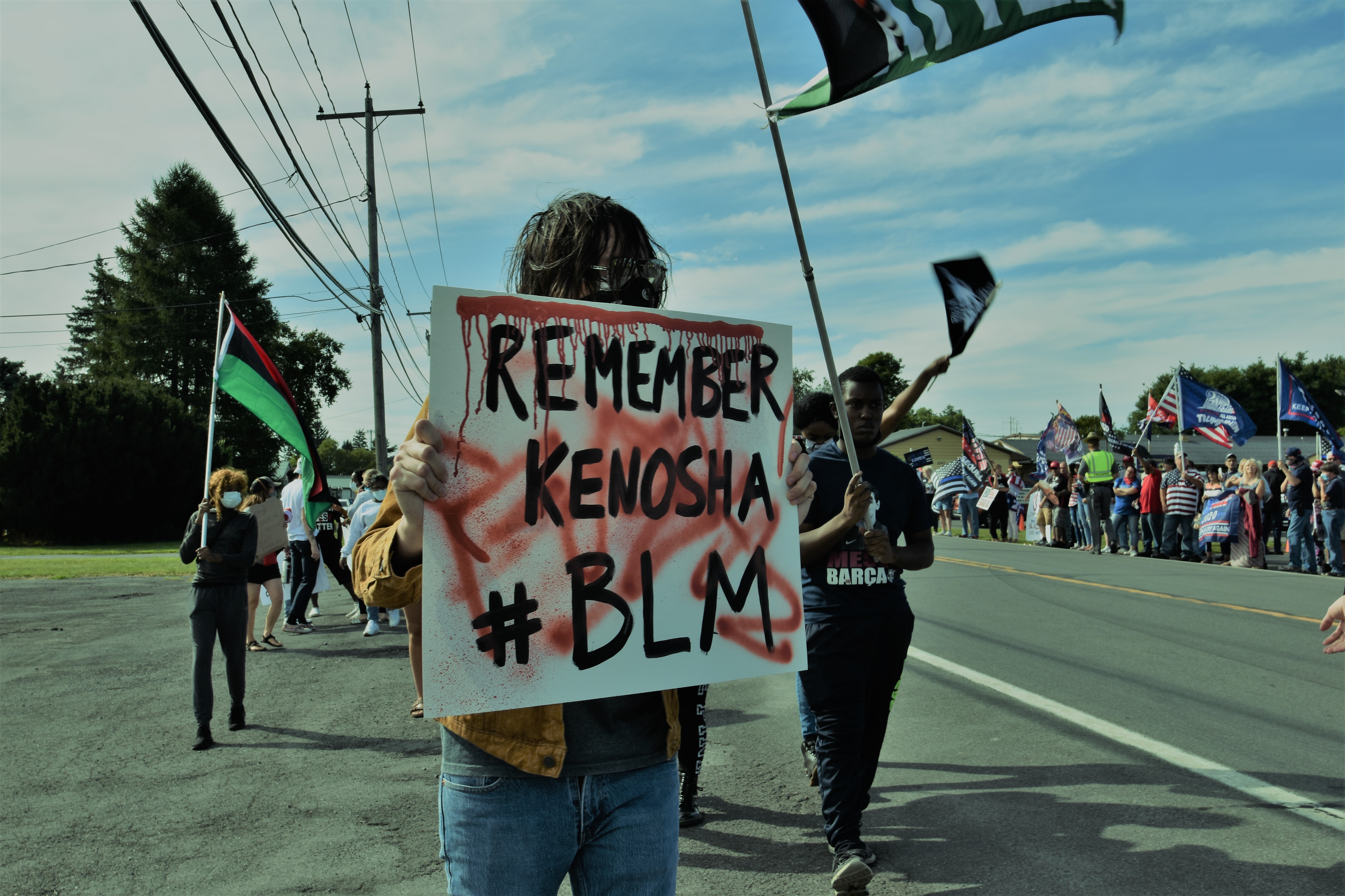 Remember Kenosha, WI where police shot shot Jacob Blake in his back in front of his children, and where two BLM activists were killed and one critically injured by teenage white militia member Kyle Rittenhouse. Trump and Tenney supporters rally in front of Dave’s Diner which sponsored and promoted the event. (Photo Credit: Love and Rage)