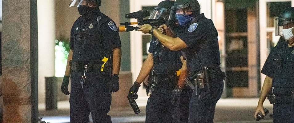 Officers began firing pepper balls shortly before 10:30 pm. An hour later, officers emerged in line formation from the building, shooting dozens of pepper balls, standing where the barricade once stood, as crowds retreated.