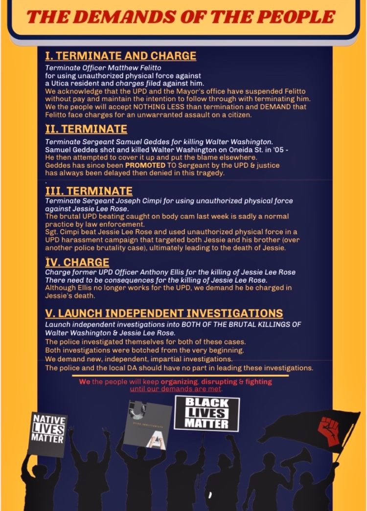 The rally was organized by the Utica Abolitionists, a multiracial group of activists organizing to push for alternatives to mass incarceration and policing. The group, which was formed over the summer, was born out of the Black Lives Matter movement sweeping the nation. Over the last few months the Abolitionists launched a Justice for Jessie campaign and Justice for Walter campaign to find justice for Jessie Lee Rose and Walter Washington who was a 38 year old Black man gunned down by the Utica police in 2005. In a press release the Abolitionists reiterated the “Demands of the People” for the rally, which were core demands in recent protests in the city.