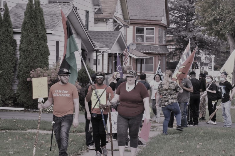 The marchers snaked their way through Cornhill, shouting, “Say his name! Walter Washington,” and “Why are we here? Jessie Lee Rose!” They made a stop at the former residence of Walter Washington – the same location where he was shot and killed by UPD Sgt. Samuel Geddes. Residents came out of their houses, including some of Walter’s relatives, and shouted out their support for the protest. One Abolitionist gave an impromptu speech about the police killing of Walter. “The UPD killing of Walter Washington was unjustified. It was a murder and a cover up. And when the officer who killed him, Sam Geddes was promoted to sergeant, the message the city sent to the people of Utica is if you’re a cop and you shoot and kill an innocent Black man, you will get rewarded!” Activists then took a knee or sat down and participated in a moment of silence for five minutes.