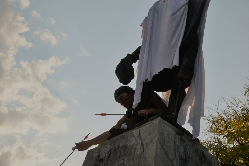 As the group chanted slogans condemning Columbus and planted their flags around the monument, one activist scrambled up the base of the monument and draped Columbus in a homemade KKK costume. In a final touch he placed two arrows on the statue, protruding from Columbus’s neck and chest.