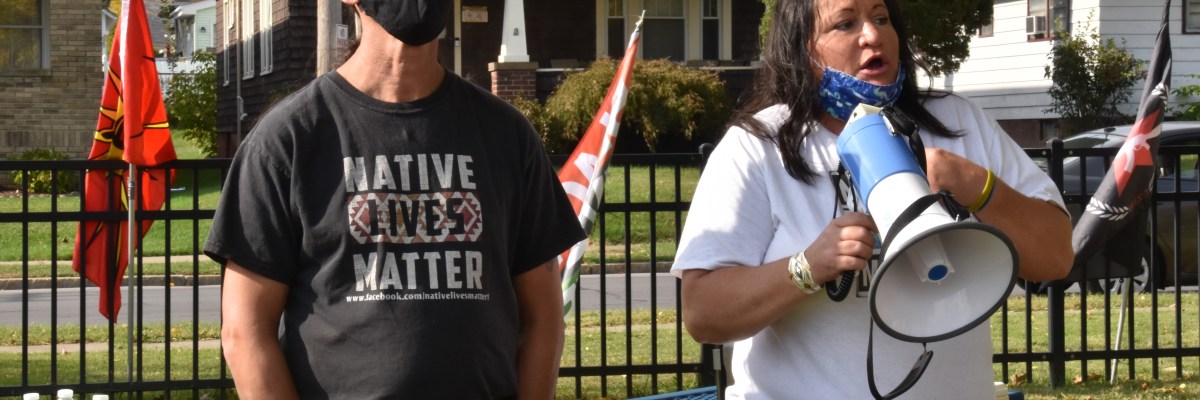 Kristine was the last to speak. Her husband Michael, donning a Native Lives Matter shirt, stood beside her. In the short pauses of her speech, you could hear the fabric of the bright purple Haudenosaunee flag flapping in the wind.